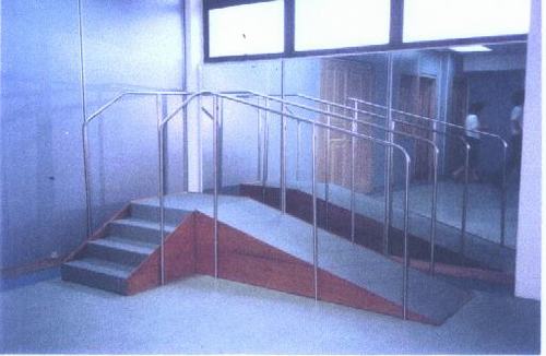 - R1606R wooden constructed with stainless steel height adjustable handrails. Step and ramp are wide enough (90cm) for attendant to walk beside patient and assist in climbing skills.